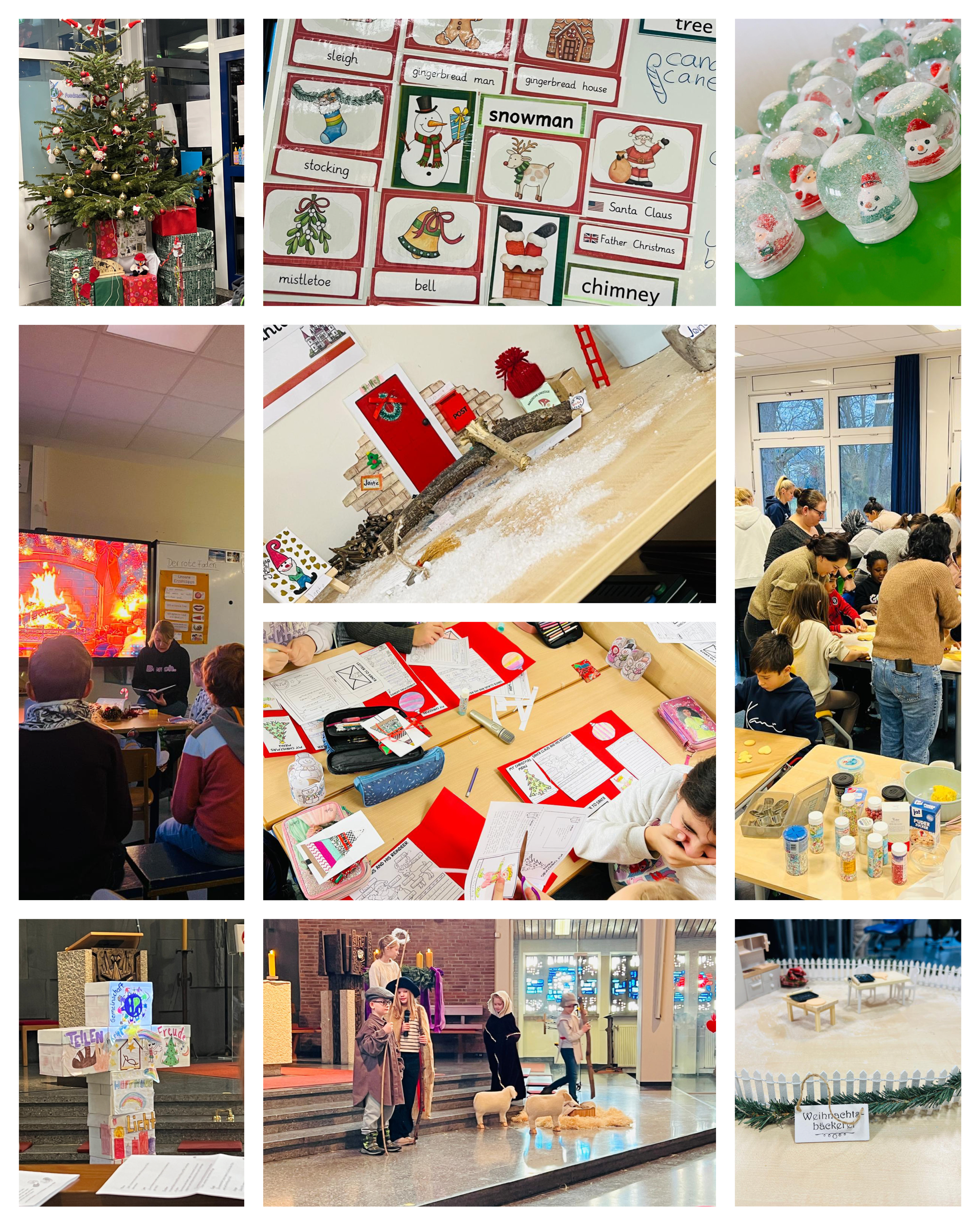 Manchmal roch es ganz besonders nach Weihnachten in unserer Schule. Denn einige Klassen haben leckere Plätzchen gebacken in der OGS-Küche. Die Eltern durften auch mit dabei sein. Während der ganzen Adventszeit durften die Kinder immer wieder von den selbst gemachten Plätzchen naschen. Nicht nur im Religionsunterricht drehte sich alles um Weihnachten und die Geburt von Jesus. Zum Beispiel wurden auch im Englischunterricht festliche Weihnachtslieder gesungen. Wir lernten viele englische Begriffe und schrieben auch dem Weihnachtsmann einen Brief.